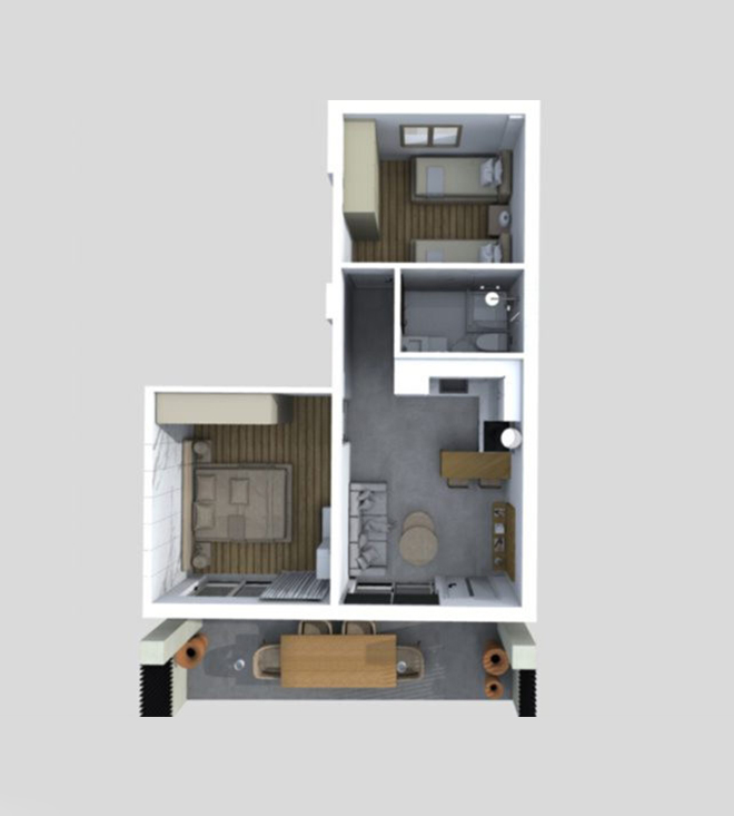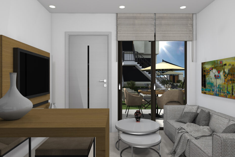 H κατοικία αποτελείται από ιδιωτικό κήπο 45τ.μ, δυο δωμάτια, σαλόνι, κουζίνα, μπάνιο και άνετα μπαλκόνια.